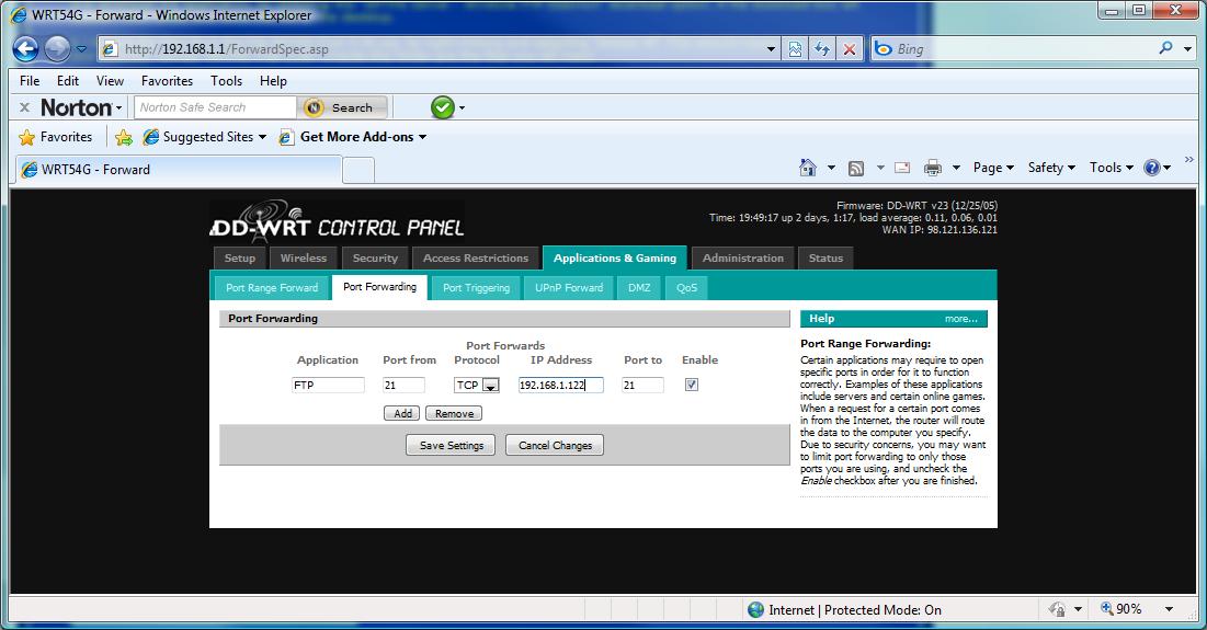 In order to extend your system to allow you to send pictures from the outside world you simple need to configure your router to forward FTP transfers though to your computer. Then you simply change the IP address in your WiCam settings to the IP address of your router. How you do the first part depends upon your router. Depending on the model of your router, the exact method to do this will be different but the follow illustrates how I did it on my router (a linksys Wireless-G 2.4).